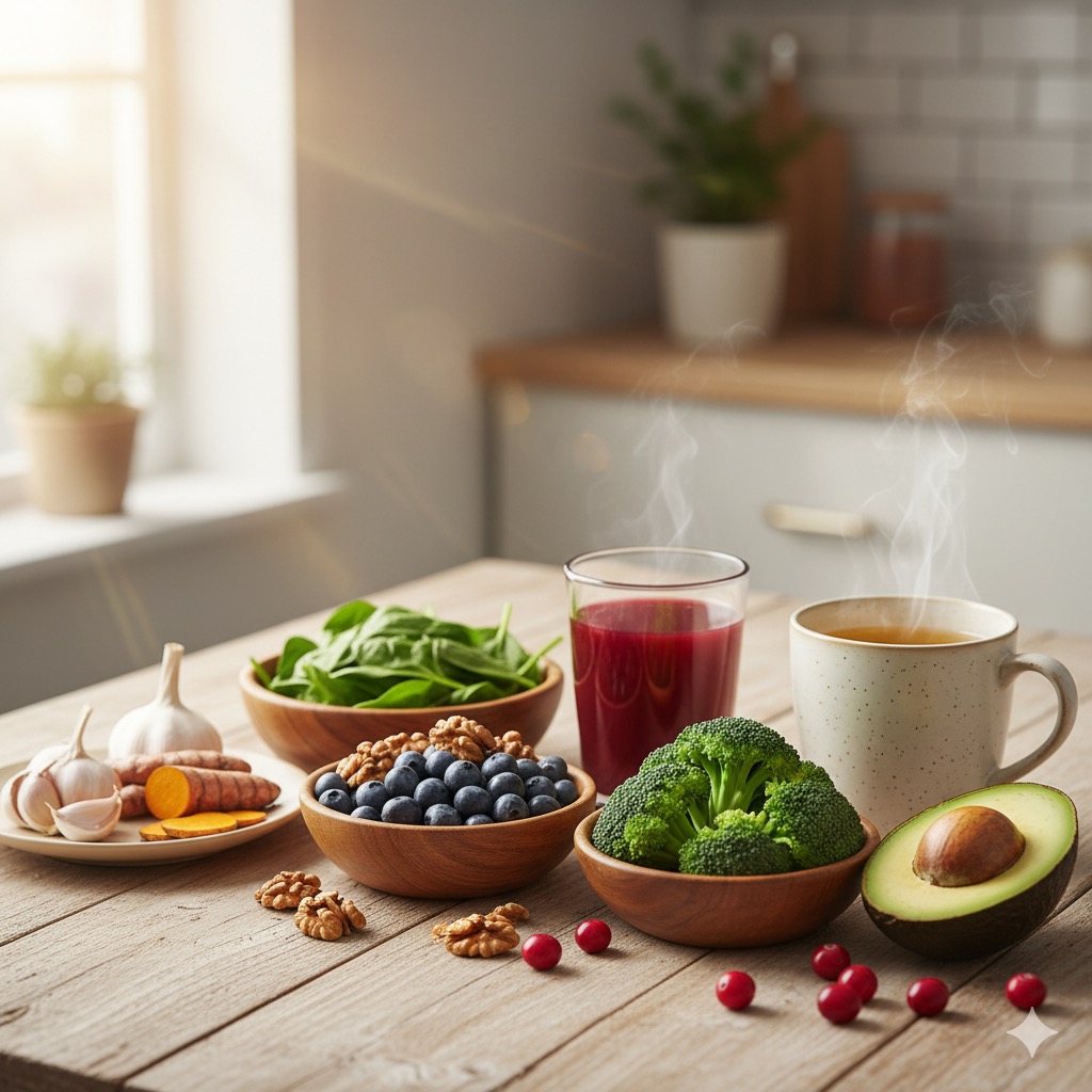 오늘 소개한 5가지 슈퍼푸드 — 비트, 브로콜리, 강황, 마늘, 아보카도 — 를 식단에 꾸준히 포함시켜 간의 회복력을 키워보세요.