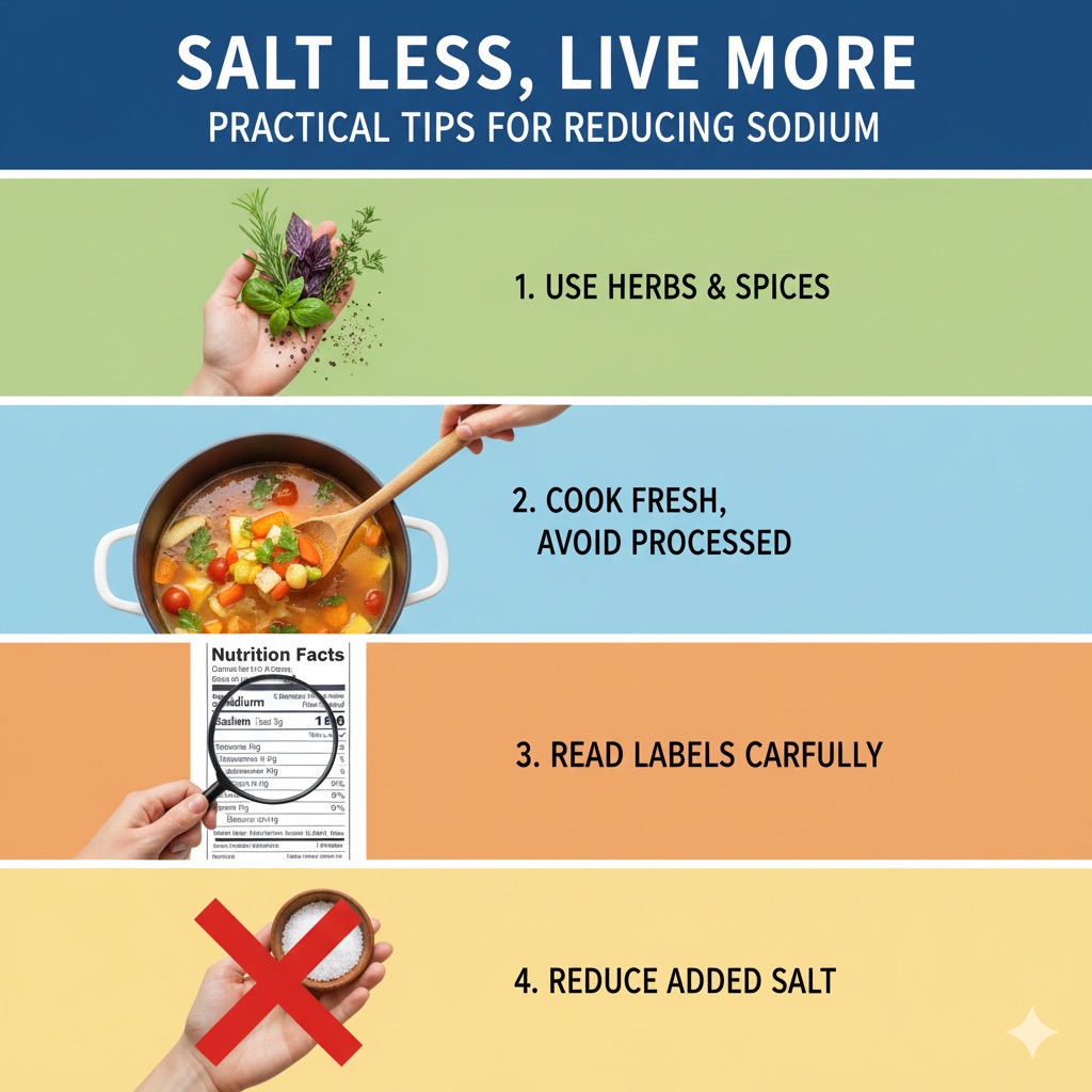 나트륨 줄이기는 일회성 캠페인이 아니라 **지속 가능한 생활 습관**이어야 합니다. 이를 위해 다음 세 가지를 기억하세요: ① 물 많이 마시기: 나트륨 배출을 돕고 혈압 조절에 효과적입니다. ② 채소와 과일 늘리기: 칼륨이 풍부해 나트륨 배출을 촉진합니다. ③ 가공식품 줄이기: 천연 식재료 위주의 식사를 유지합니다. 또한 하루 한 끼는 ‘저염식’을 실천해 보세요 — 예를 들어, 나물무침은 간을 줄이고 참기름으로 풍미를 더하거나, 국물 요리는 된장국 대신 맑은 채소국으로 대체할 수 있습니다. 작은 변화 하나하나가 결국 나트륨 섭취를 절반 이하로 줄이는 결과를 만듭니다. 건강은 하루아침에 바뀌지 않지만, **식습관의 작은 선택이 평생의 건강을 지킨다**는 사실을 기억하세요.