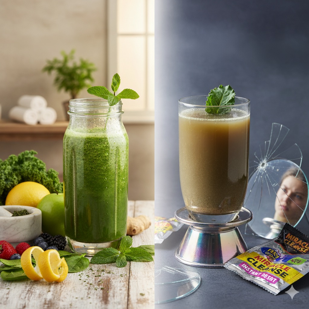 실제로 체내 독소는 간·신장·폐·피부를 통해 자연적으로 배출됩니다. 주스만으로 독소를 ‘씻어내는’ 것은 과학적 근거가 부족합니다. - ❌ “디톡스 주스로 지방이 녹는다”