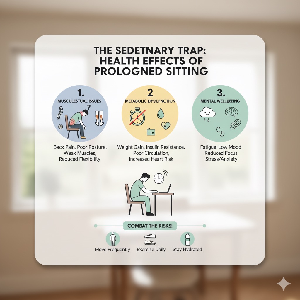 장시간 앉아 있으면 다리 근육의 수축이 줄어들어 혈액순환이 원활하지 않게 된다. 그 결과, 다리 부종이나 정맥류가 생기고 혈액이 심장으로 돌아가는 속도가 느려진다. 이로 인해 혈전(피떡)이 생기기 쉬워지며, 심하면 폐색전증으로 이어질 수도 있다. 또한 움직이지 않으면 근육이 에너지를 소비하지 못해 혈당 조절 기능이 약해지고, 인슐린 저항성이 증가한다. 이는 결국 운동 부족으로 인한 제2형 당뇨병과 비만의 주요 원인이 된다. 특히 복부 지방이 늘어나면 혈중 중성지방이 상승해 콜레스테롤 불균형이 발생한다. 이러한 대사 이상은 심혈관 질환으로 발전할 위험을 높인다. 즉, 오랜 시간 앉아 있는 습관은 단순히 허리 통증을 넘어서 ‘만성 질환의 출발점’이 된다.